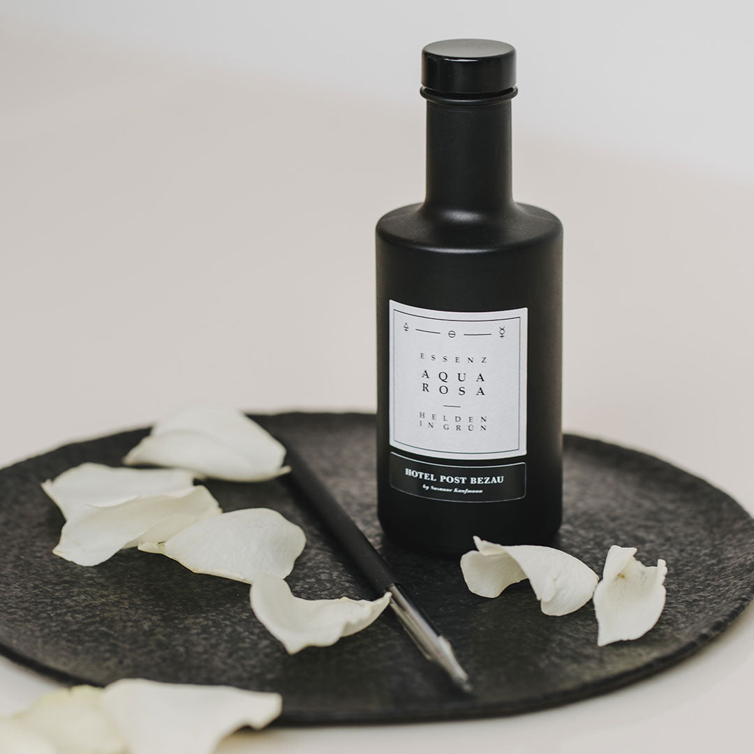 Die Schönheitsessenz Aqua Rosa sorgt durch ihre enthaltenen Alpenkräuter für innere Balance und ein Erblühen Ihrer natürlichen Strahlkraft. Rosenblüten gepaart mit den angenehm kühlen Aromen von Malve, Hafer und Stiefmütterchen wirken verjüngend und erwecken die Jugendlichkeit. Die Essenz ist eine Zusammenarbeit von Helden in Grün und dem Hotel Post Bezau by Susanne Kaufmann.